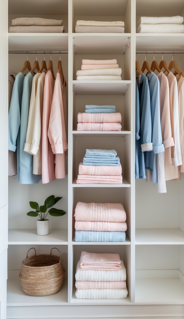 Soft neutrals and open shelving create a peaceful, clutter-free vibe. Folding essentials by category keeps your closet feeling spacious while making everyday items easy to grab.