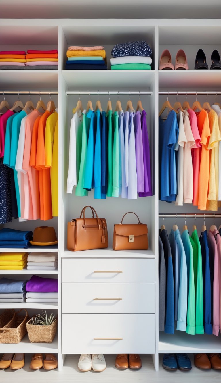 Separating shelves, hanging rods, and drawers makes everything easy to find. This layout helps you organize by category, making daily outfit choices quicker and less overwhelming.
