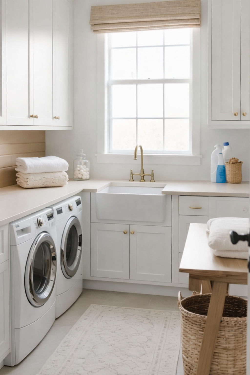 A bright laundry room featuring two front-loading washing machines, a white sink with a gold faucet, and a wooden countertop. Above, there are white cabinets with gold handles, a window with a woven shade, and neatly stacked towels and a basket. The floor is tiled with a patterned rug.