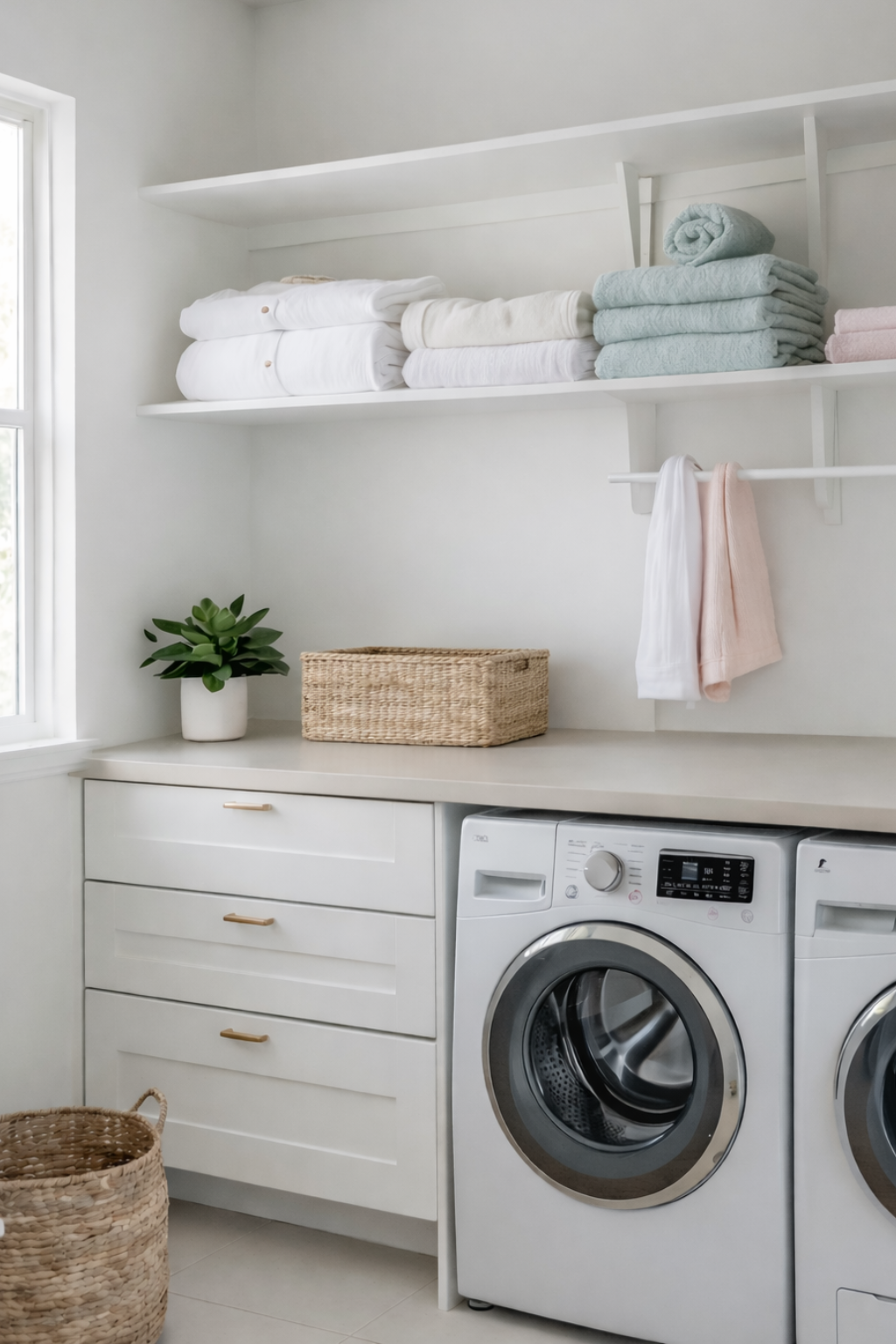 A modern laundry room featuring white front-loading washing and drying machines, neatly stacked towels on the machines, and decorative baskets. Above, there are shelves displaying a potted plant, decorative bottles, and more towels, all illuminated by soft natural light.